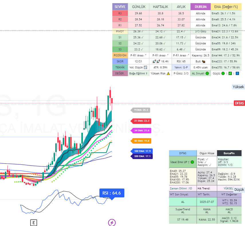 Borsapin EMA Sinyal Tablosu, Fibonacci sayı dizisine dayalı EMA (Üstel Hareketli Ortalama) sistemini kullanarak yatırımcılara üç farklı zaman diliminde (kısa, orta, uzun vade) sinyal üreten gelişmiş bir indikatördür.